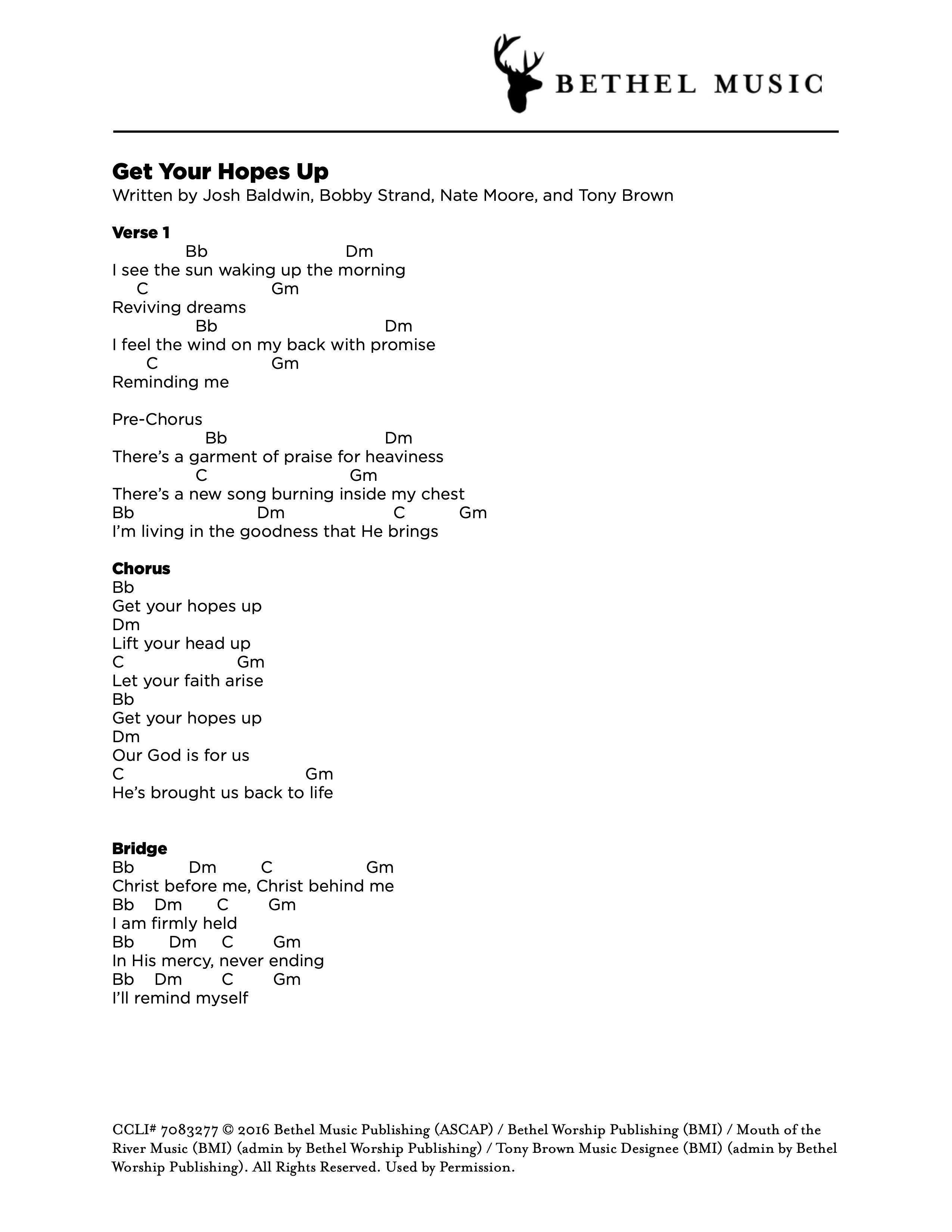 © 2016 Bethel Music Publishing (ASCAP) / Bethel Worship Publishing (BMI) / Mouth of the River Music (BMI) (admin by Bethel Worship Publishing) / Tony Brown Music Designee (BMI) (admin by Bethel Worship Publishing). All Rights Reserved. Used by Permission.
