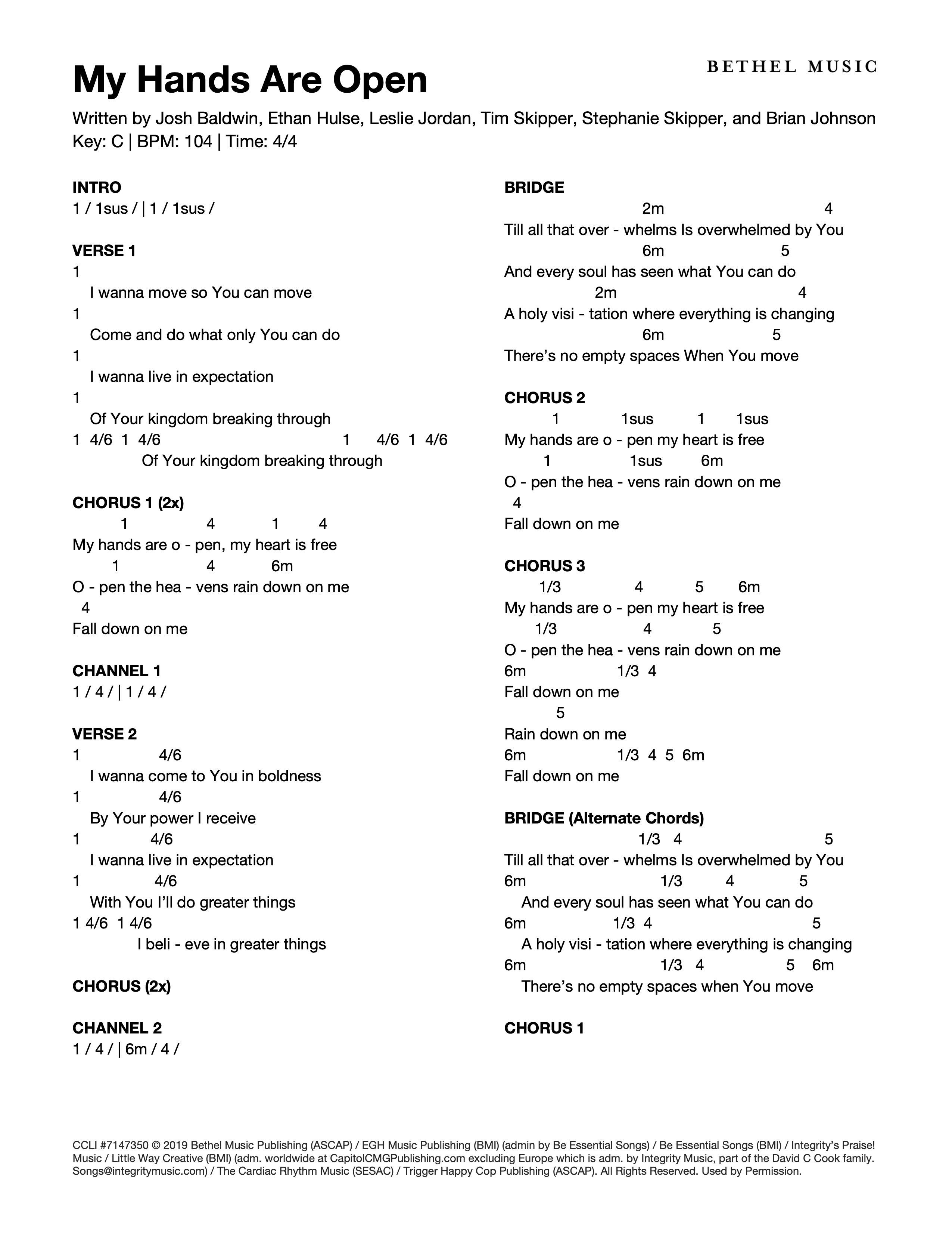 © 2019 Bethel Music Publishing (ASCAP) / EGH Music Publishing (BMI) (admin by Be Essential Songs) / Be Essential Songs (BMI) / Integrity’s Praise! Music / Little Way Creative (BMI) (adm. worldwide at CapitolCMGPublishing.com excluding Europe which is adm. by Integrity Music, part of the David C Cook family. [email protected]) / The Cardiac Rhythm Music (SESAC) / Trigger Happy Cop Publishing (ASCAP). All Rights Reserved. Used by Permission.