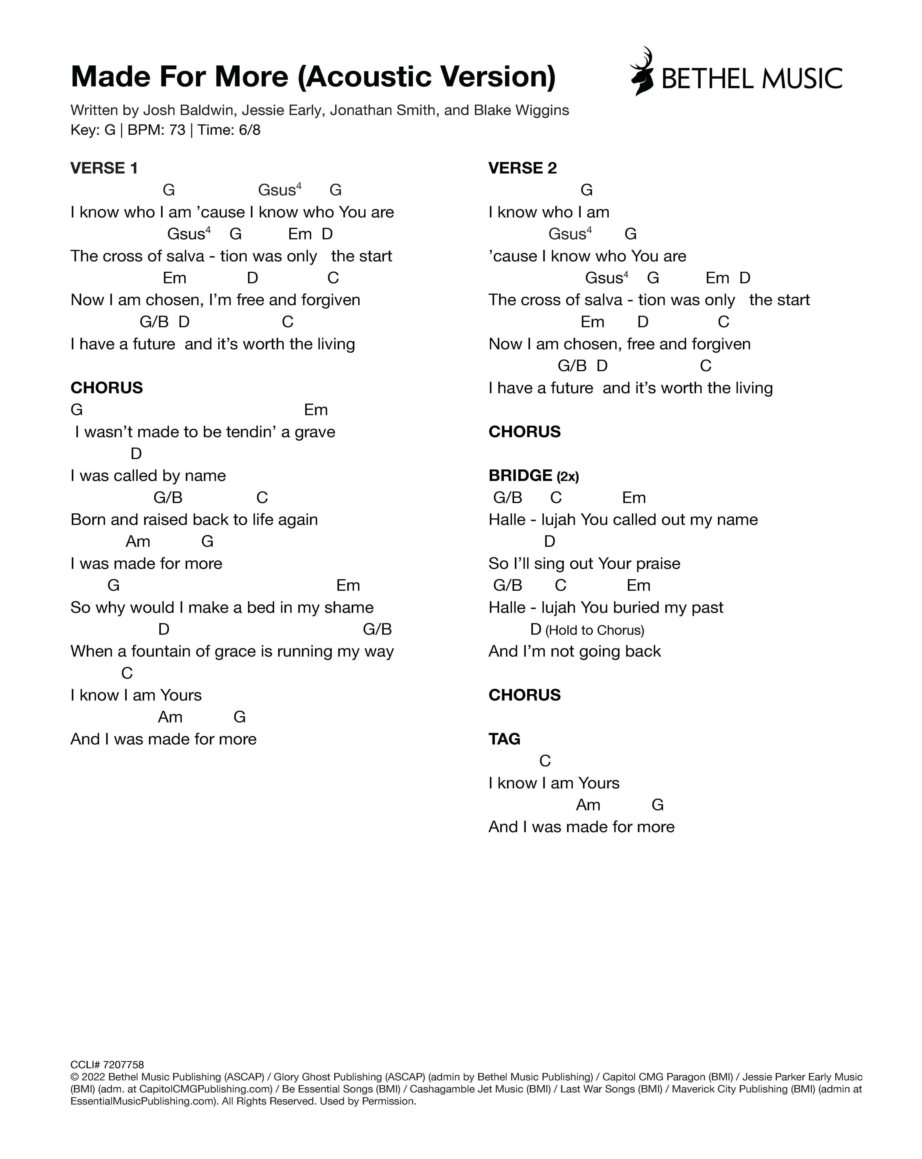 © 2022 Bethel Music Publishing (ASCAP) / Glory Ghost Publishing (ASCAP) (admin by Bethel Music Publishing) / Capitol CMG Paragon (BMI) / Jessie Parker Early Music (BMI) (adm. at CapitolCMGPublishing.com) / Be Essential Songs (BMI) / Cashagamble Jet Music (BMI) / Last War Songs (BMI) / Maverick City Publishing (BMI) (admin at EssentialMusicPublishing.com). All Rights Reserved. Used by Permission.