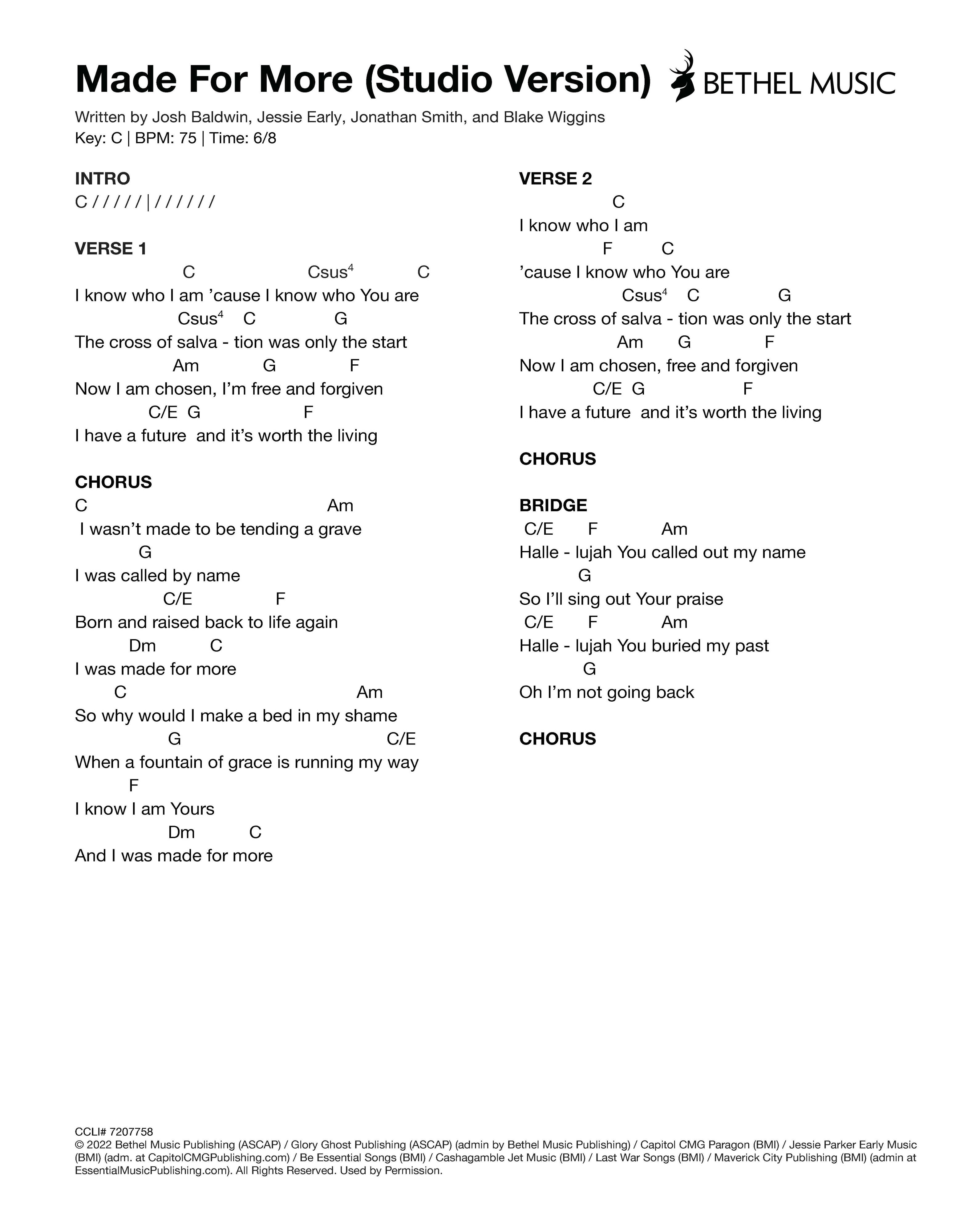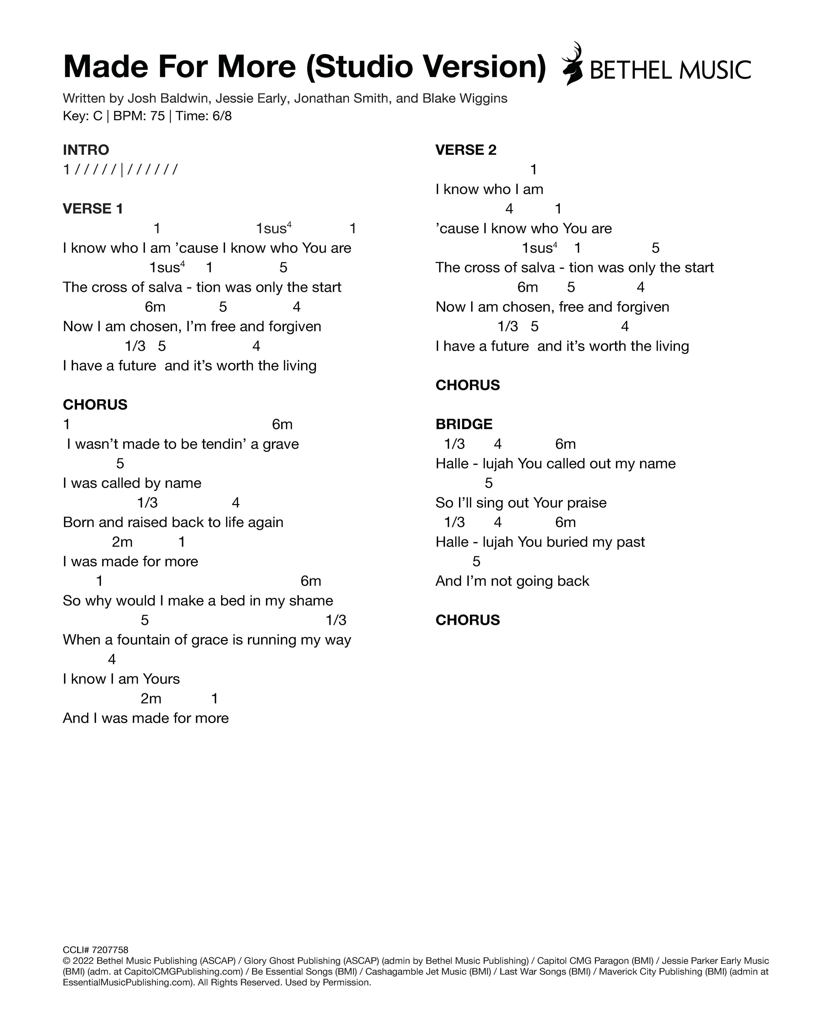© 2022 Bethel Music Publishing (ASCAP) / Glory Ghost Publishing (ASCAP) (admin by Bethel Music Publishing) / Capitol CMG Paragon (BMI) / Jessie Parker Early Music (BMI) (adm. at CapitolCMGPublishing.com) / Be Essential Songs (BMI) / Cashagamble Jet Music (BMI) / Last War Songs (BMI) / Maverick City Publishing (BMI) (admin at EssentialMusicPublishing.com). All Rights Reserved. Used by Permission.