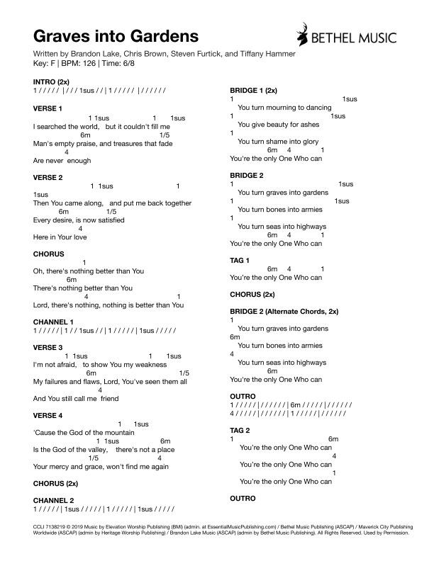© 2019 Music by Elevation Worship Publishing (BMI) (admin. at EssentialMusicPublishing.com) / Bethel Music Publishing (ASCAP) / Maverick City Publishing Worldwide (ASCAP) (admin by Heritage Worship Publishing) / Brandon Lake Music (ASCAP) (admin by Bethel Music Publishing). All Rights Reserved. Used by Permission.