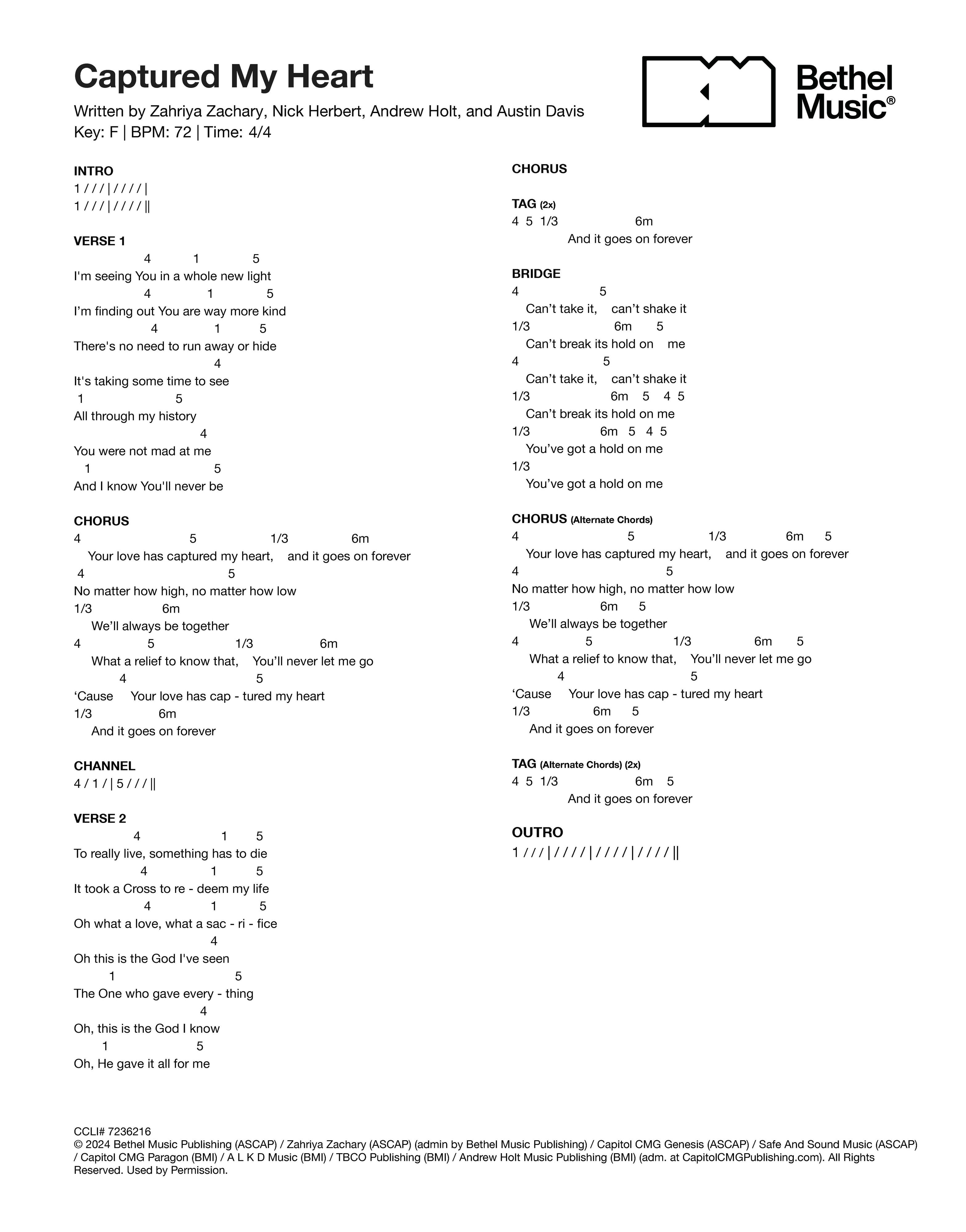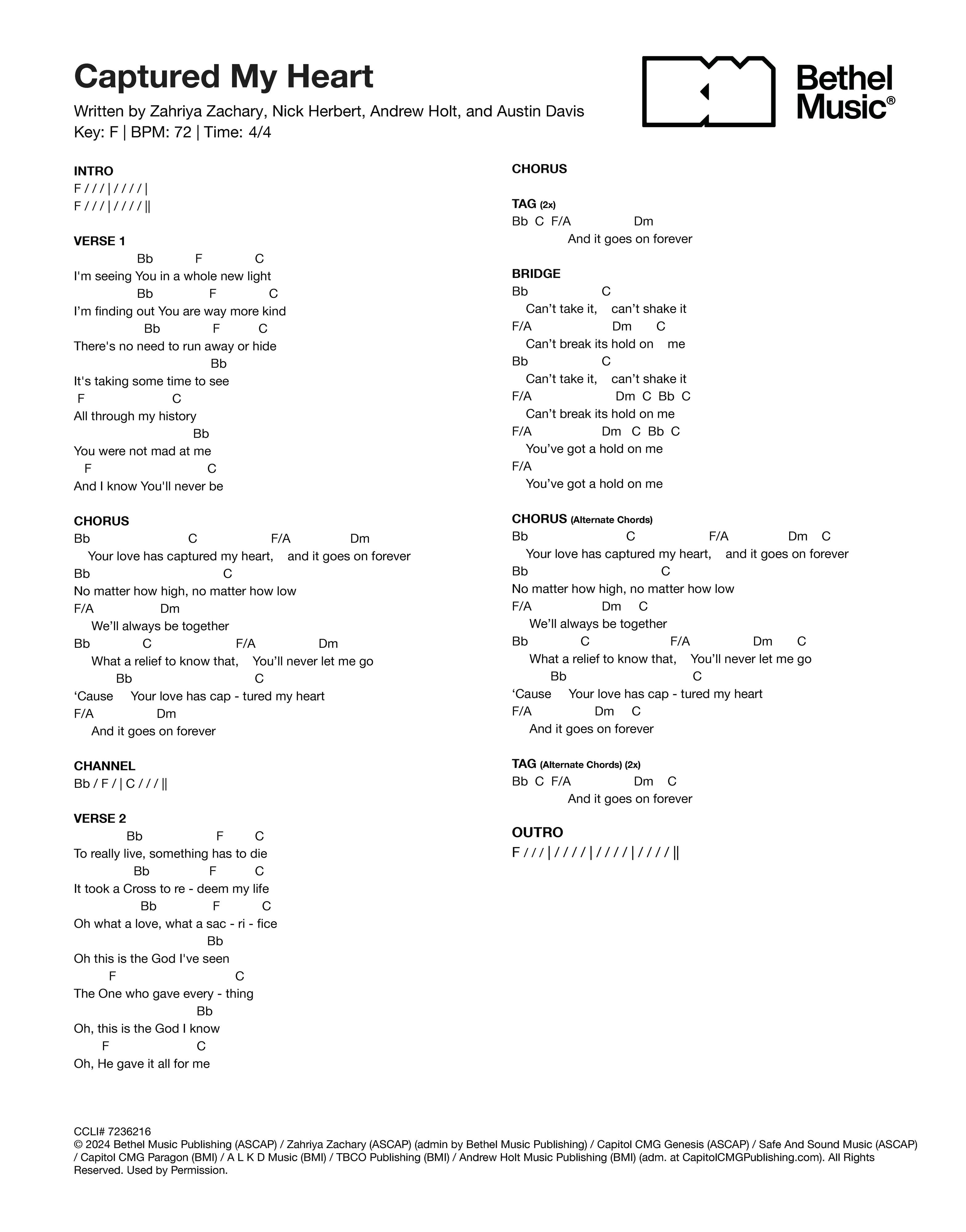 © 2024 Bethel Music Publishing (ASCAP) / Zahriya Zachary (ASCAP) (admin by Bethel Music Publishing) / Capitol CMG Genesis (ASCAP) / Safe And Sound Music (ASCAP) / Capitol CMG Paragon (BMI) / A L K D Music (BMI) / TBCO Publishing (BMI) / Andrew Holt Music Publishing (BMI) (adm. at CapitolCMGPublishing.com). All Rights Reserved. Used by Permission.