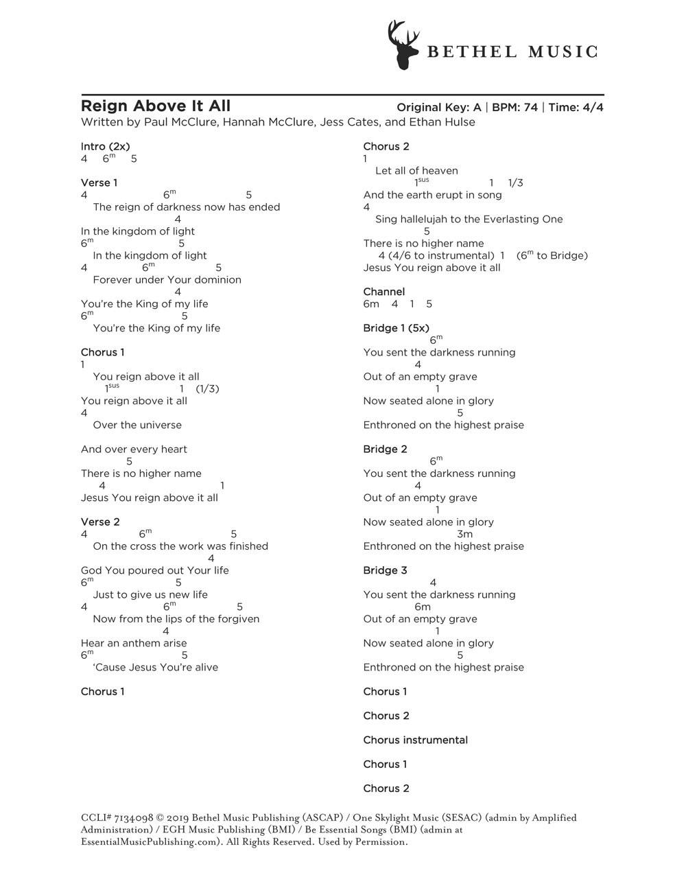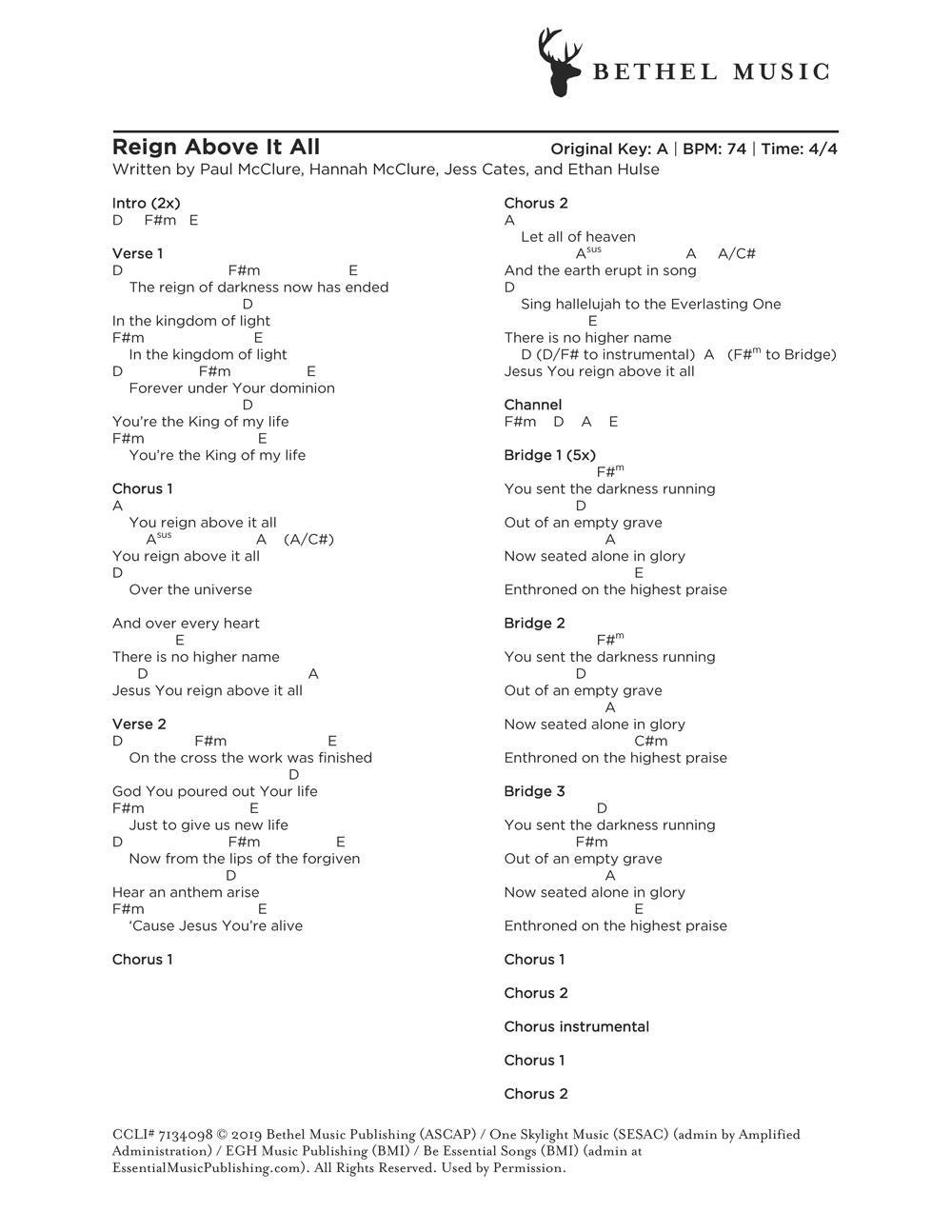 © 2019 Bethel Music Publishing (ASCAP) / One Skylight Music (SESAC) (admin by Amplified Administration) / EGH Music Publishing (BMI) / Be Essential Songs (BMI) (admin at EssentialMusicPublishing.com). All Rights Reserved. Used by Permission.