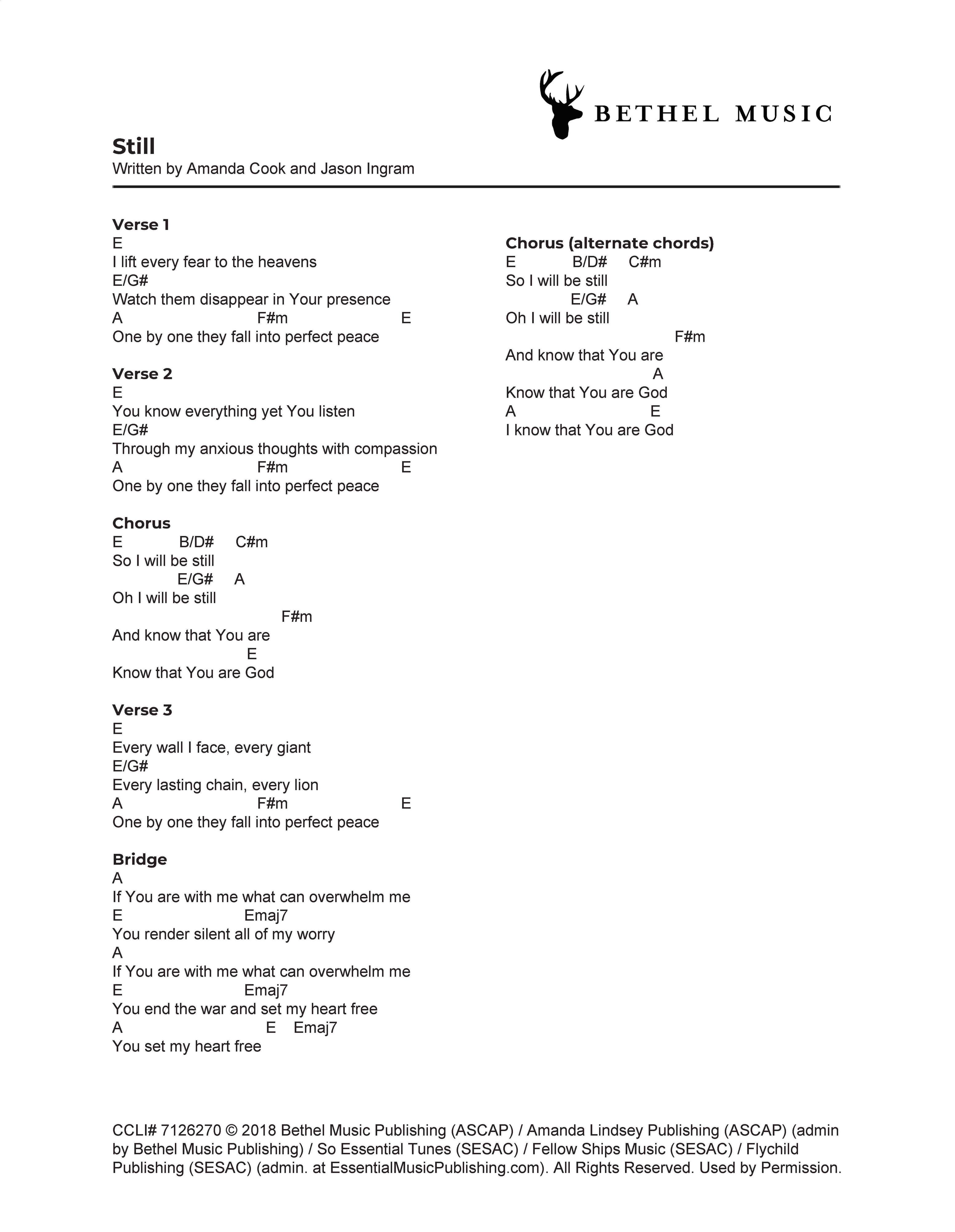 © 2018 Bethel Music Publishing (ASCAP) / Amanda Lindsey Publishing (ASCAP) (admin by Bethel Music Publishing) / So Essential Tunes (SESAC) / Fellow Ships Music (SESAC) / Flychild Publishing (SESAC) (admin. at EssentialMusicPublishing.com). All Rights Reserved. Used by Permission.