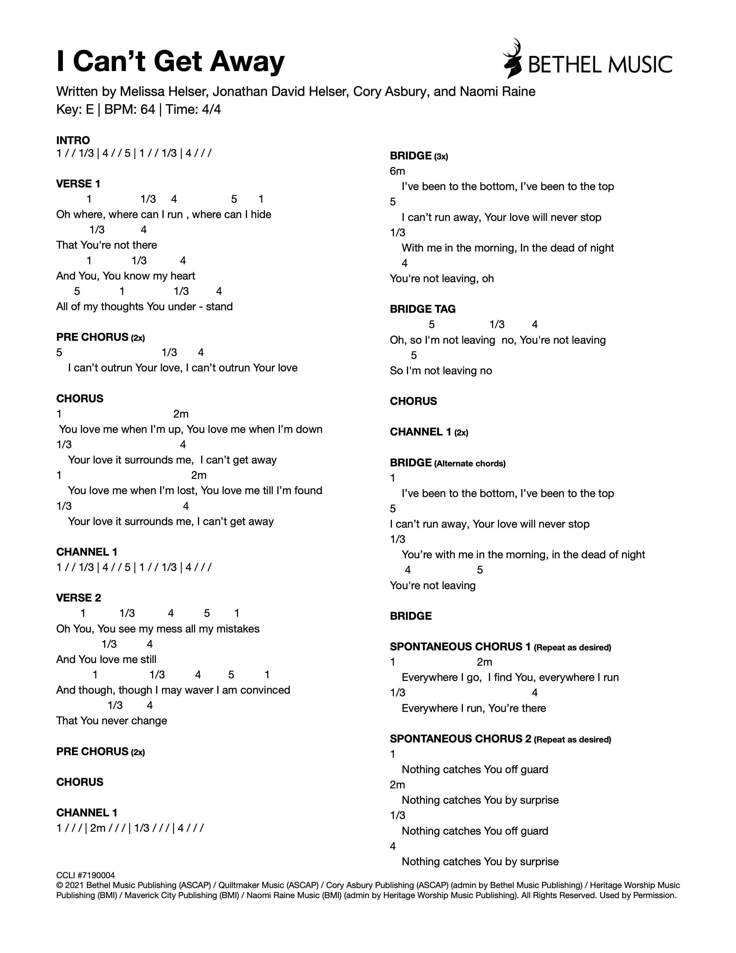 © 2021 Bethel Music Publishing (ASCAP) / Quiltmaker Music (ASCAP) / Cory Asbury Publishing (ASCAP) (admin by Bethel Music Publishing) / Heritage Worship Music Publishing (BMI) / Maverick City Publishing (BMI) / Naomi Raine Music (BMI) (admin by Heritage Worship Music Publishing). All Rights Reserved. Used by Permission.