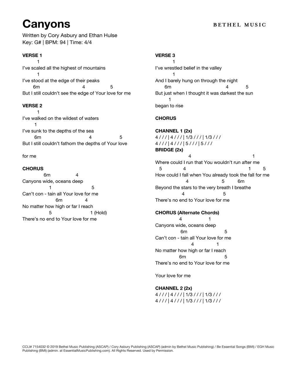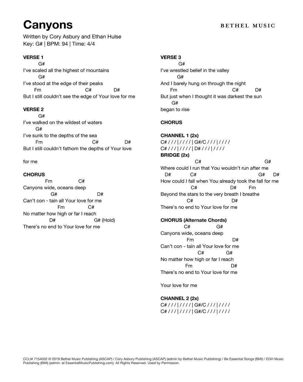 © 2019 Bethel Music Publishing (ASCAP) / Cory Asbury Publishing (ASCAP) (admin by Bethel Music Publishing) / Be Essential Songs (BMI) / EGH Music Publishing (BMI) (admin. at EssentialMusicPublishing.com). All Rights Reserved. Used by Permission.