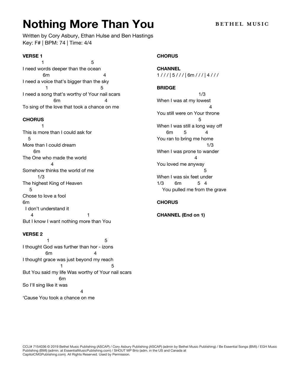 © 2019 Bethel Music Publishing (ASCAP) / Cory Asbury Publishing (ASCAP) (admin by Bethel Music Publishing) / Be Essential Songs (BMI) / EGH Music Publishing (BMI) (admin. at EssentialMusicPublishing.com) / SHOUT MP Brio (adm. in the US and Canada at CapitolCMGPublishing.com). All Rights Reserved. Used by Permission.