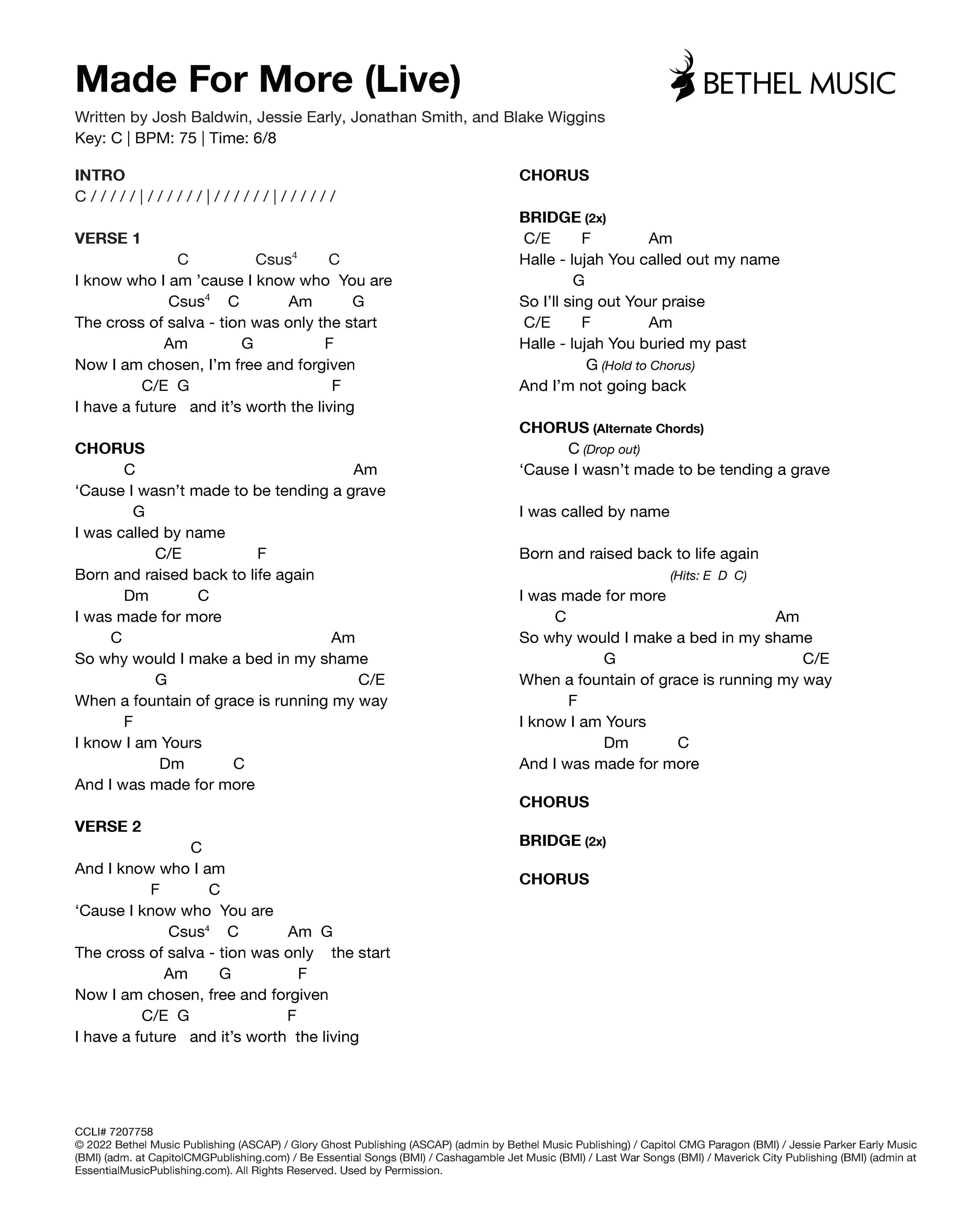 © 2022 Bethel Music Publishing (ASCAP) / Glory Ghost Publishing (ASCAP) (admin by Bethel Music Publishing) / Capitol CMG Paragon (BMI) / Jessie Parker Early Music (BMI) (adm. at CapitolCMGPublishing.com) / Be Essential Songs (BMI) / Cashagamble Jet Music (BMI) / Last War Songs (BMI) / Maverick City Publishing (BMI) (admin at EssentialMusicPublishing.com). All Rights Reserved. Used by Permission.