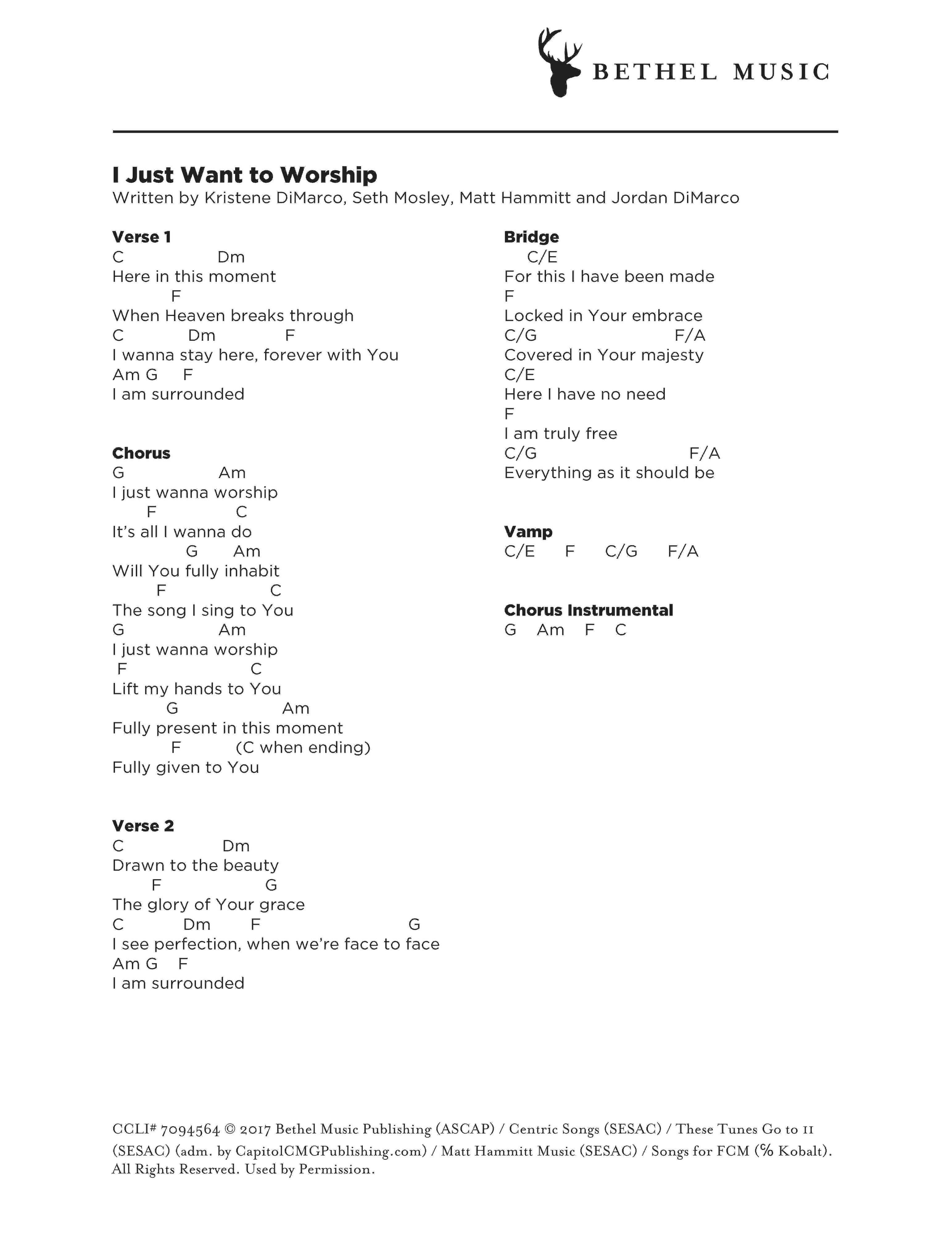 © 2017 Bethel Music Publishing (ASCAP) / Centric Songs (SESAC) / These Tunes Go to 11 (SESAC) (adm. by CapitolCMGPublishing.com) / Matt Hammitt Music (SESAC) / Songs for FCM (SESAC) (c/o Kobalt). All Rights Reserved. Used by Permission.