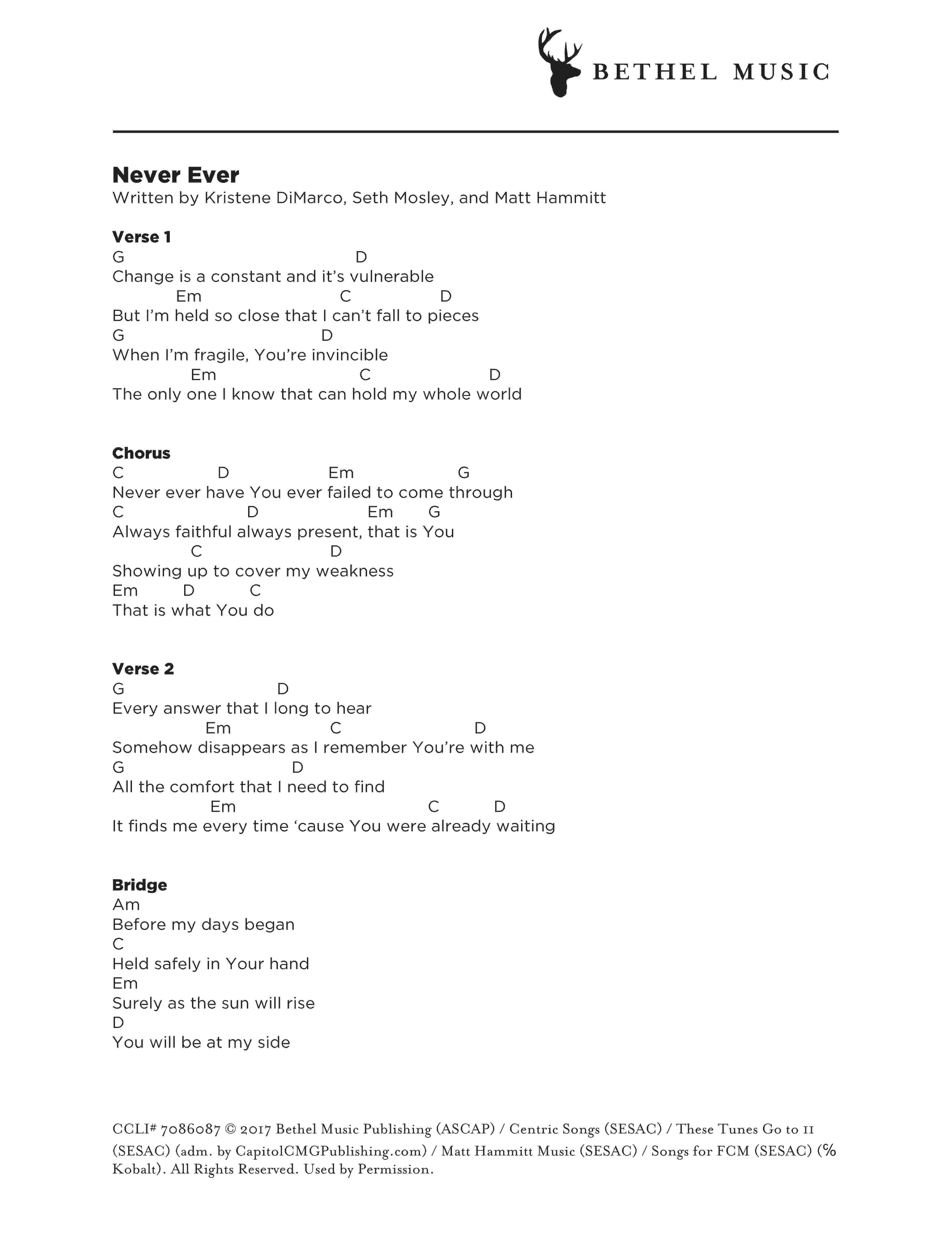 © 2017 Bethel Music Publishing (ASCAP) / Centric Songs (SESAC) / These Tunes Go to 11 (SESAC) (adm. by CapitolCMGPublishing.com) / Matt Hammitt Music (SESAC) / Songs for FCM (SESAC) (c/o Kobalt). All Rights Reserved. Used by Permission.