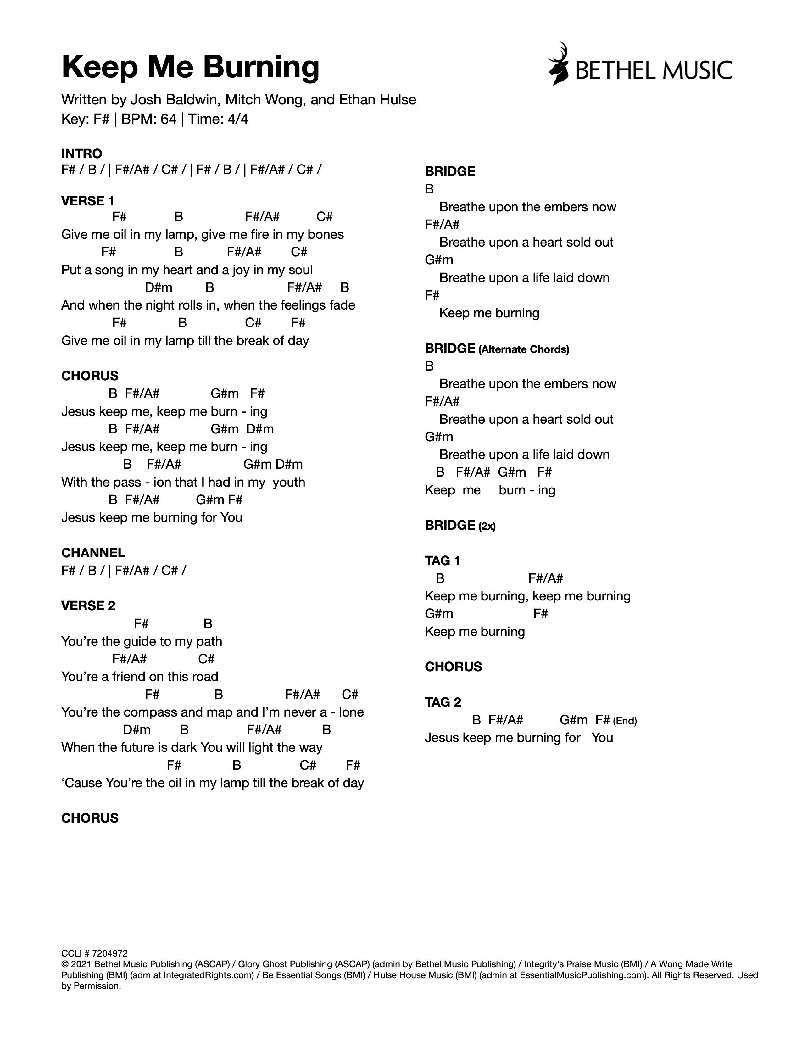 © 2021 Bethel Music Publishing (ASCAP) / Glory Ghost Publishing (ASCAP) (admin by Bethel Music Publishing) / Integrity’s Praise Music (BMI) / A Wong Made Write Publishing (BMI) (adm at IntegratedRights.com) / Be Essential Songs (BMI) / Hulse House Music (BMI) (admin at EssentialMusicPublishing.com). All Rights Reserved. Used by Permission.