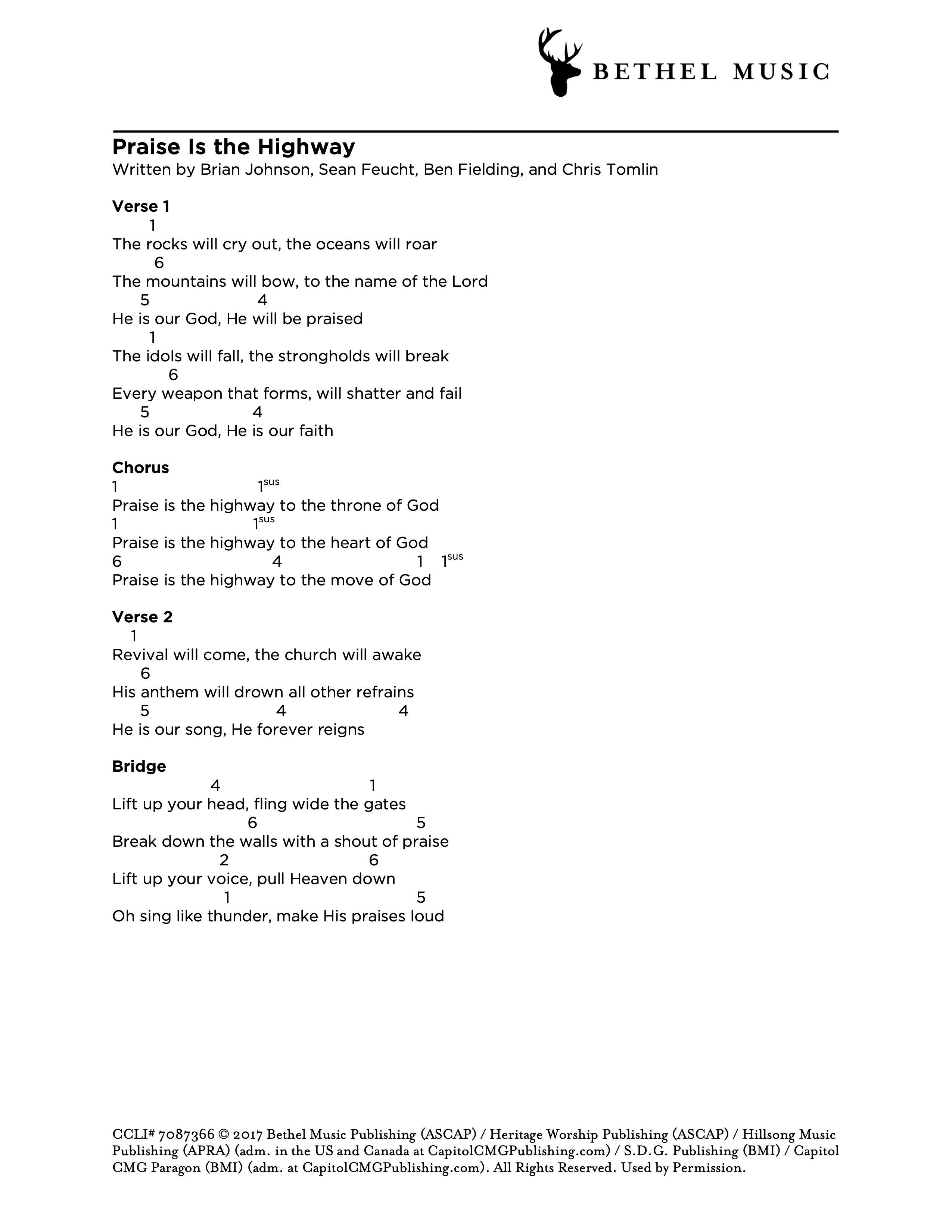 © 2017 Bethel Music Publishing (ASCAP) / Heritage Worship Publishing (ASCAP) / Hillsong Music Publishing (APRA) (adm. in the US and Canada at CapitolCMGPublishing.com) / S.D.G. Publishing (BMI) / Capitol CMG Paragon (BMI) (adm. at CapitolCMGPublishing.com). All Rights Reserved. Used by Permission.